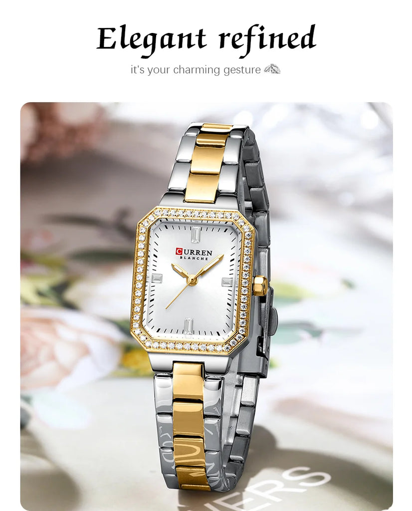 CURREN Montres de marque de luxe pour femmes Cadran rectangulaire simple avec strass scintillants Montre-bracelet à quartz décontractée avec lumineux